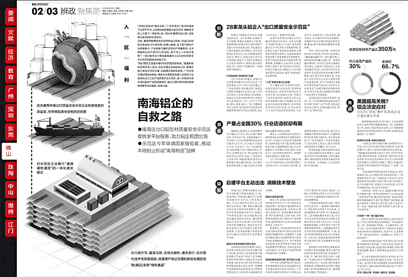 南海区出口铝型材质量安全示范区提供全平台服务,助力铝企抱团出海。示范区今年申请国家级验收,推动本地铝业形成“南海制造”品牌。 入“区”福利 “对我们的影响?基本没有。”广东华昌铝厂副总经理武卫社语气平淡。3月底他接受南都记者采访时,刚刚在手机上又看了一则新闻,是一则分析美国对进口钢、铝制品征收关税的全球影响。