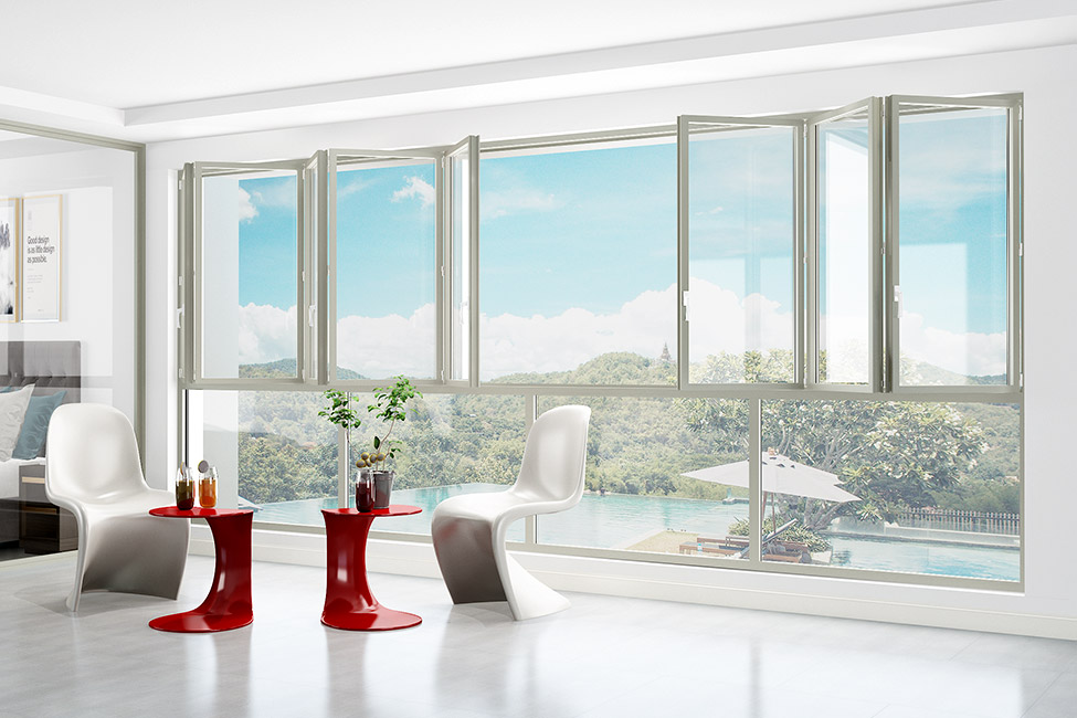 折叠窗是阳台装修的神器,打破空间的限制,全畅开启,有多大就可以敞开多大,更贴近自然,没有视野盲区,可以任意的角度看窗外的风景。