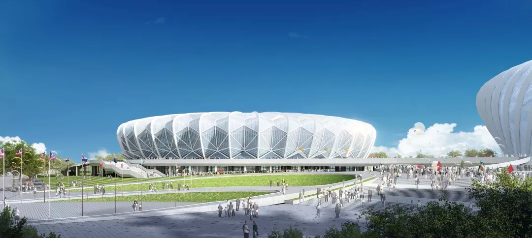 整个建筑动感流畅的飘落于奥体中心基地平台之上,犹如一顶光芒四射的“桂冠”,寓意了体育运动激情拼搏、勇争冠军的精神。