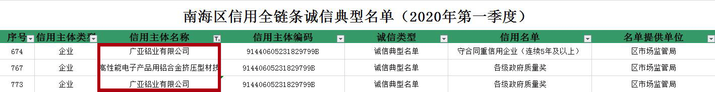 近日,佛山市南海区发改局发布了《关于发布2020年第一季度南海区全链条信用名单的公告》。该公告包括了12类诚信典型名单信息898条,13类严重失信记录名单信息24676条,共涉及25574家企业和个人。ballbet贝博铝业凭借“连续十六年守合同重信用企业”、南海区政府质量奖一线班组奖等3项信用记录入选全链条诚信典型企业。