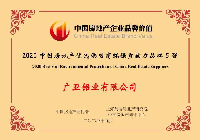 ballbet贝博铝业荣获“2020中国房地产优选供应商环保贡献力品牌5强”