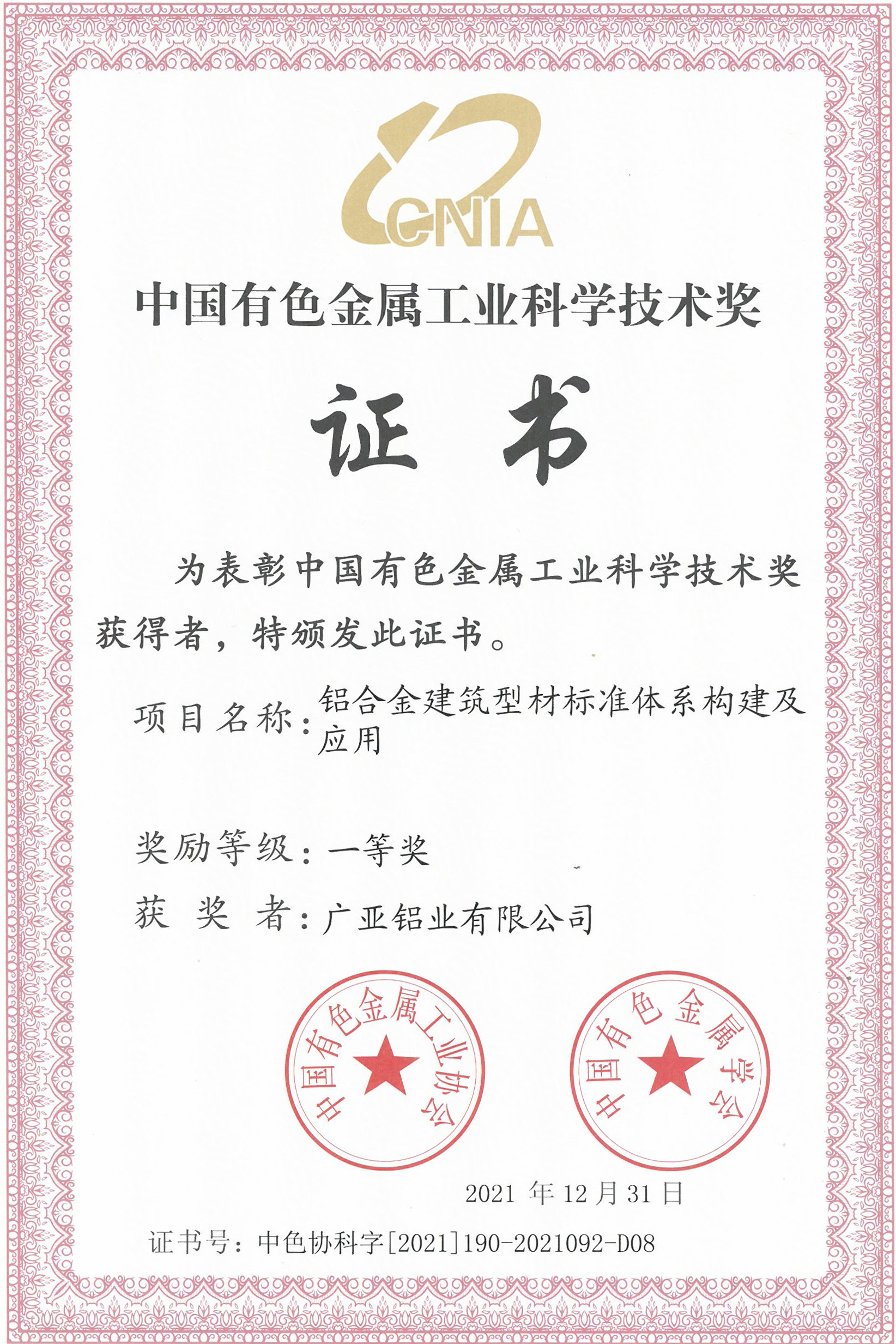 参与攻关的“铝合金建筑型材标准体系构建及应用”项目荣获中国有色金属工业科学技术奖一等奖。