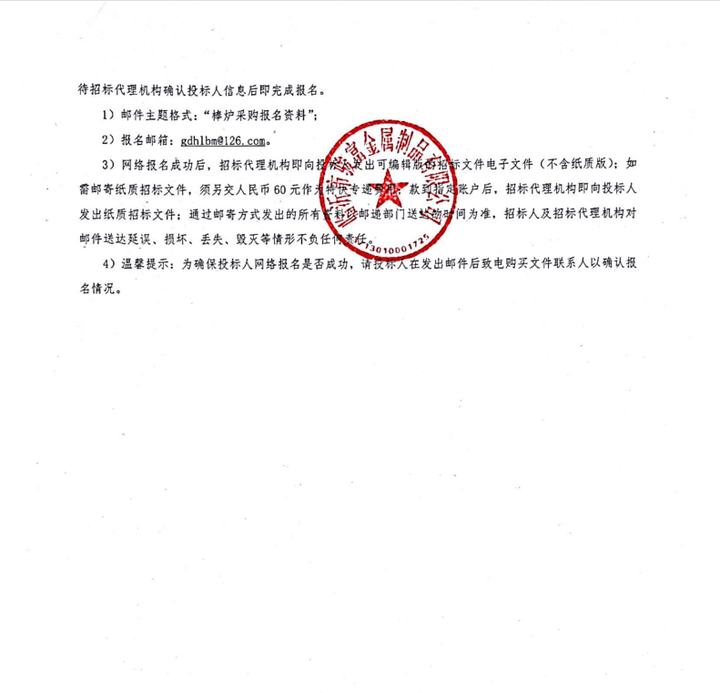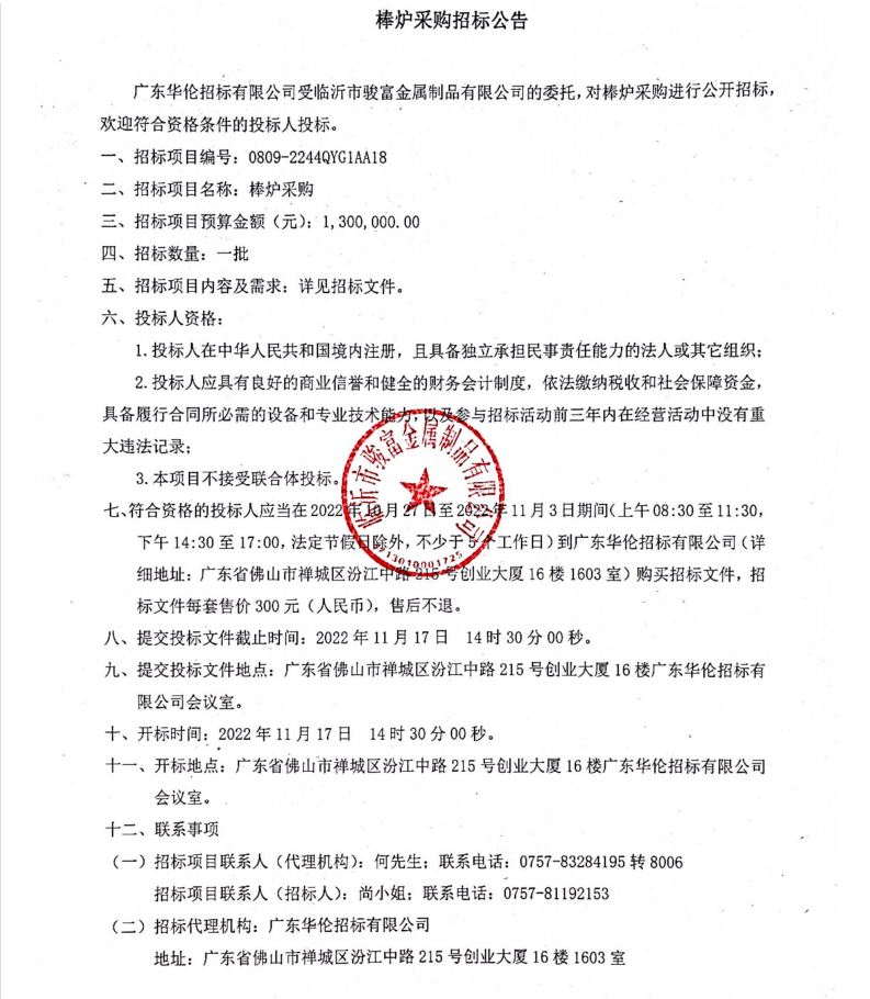 山东骏富棒炉采购-招标公告 字体大小: 小 中 大 更新日期:2022-10-27 | 返回 上一篇:知识城ballbet贝博(广州)控股集团有限公司辅料采购项目征集公告 下一篇:山东骏富立式喷涂线-招标公告