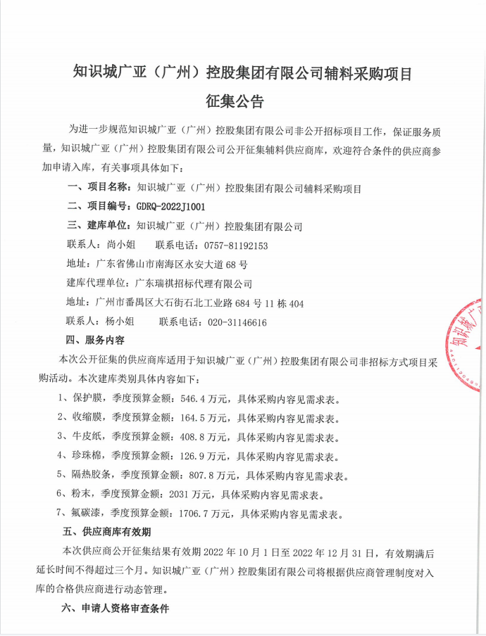 知识城ballbet贝博(广州)控股集团有限公司辅料采购项目征集公告