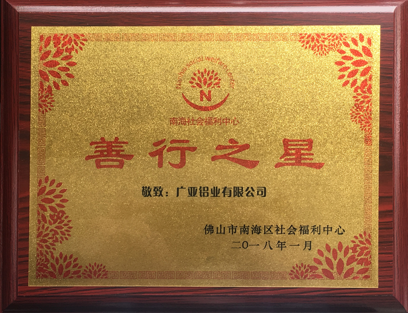 2018年1月20日,不忘初心、义爱同行——2017南海区社会福利中心爱心嘉许仪式在中心活动厅举行。ballbet贝博铝业作为福利中心星光老年之家爱心连廊捐赠者,及多年一贯的善行义举获颁南海区“善行之星”。
